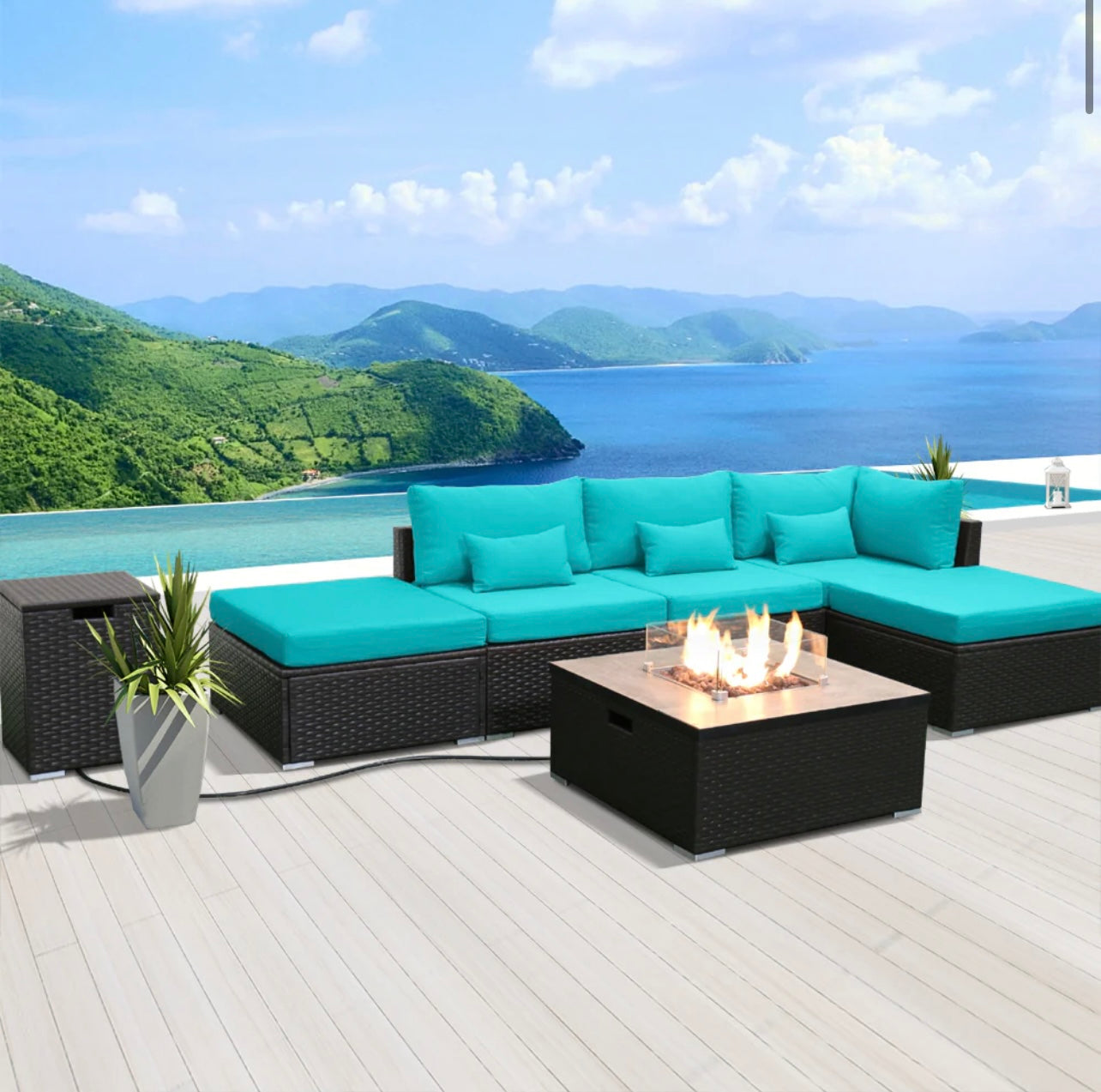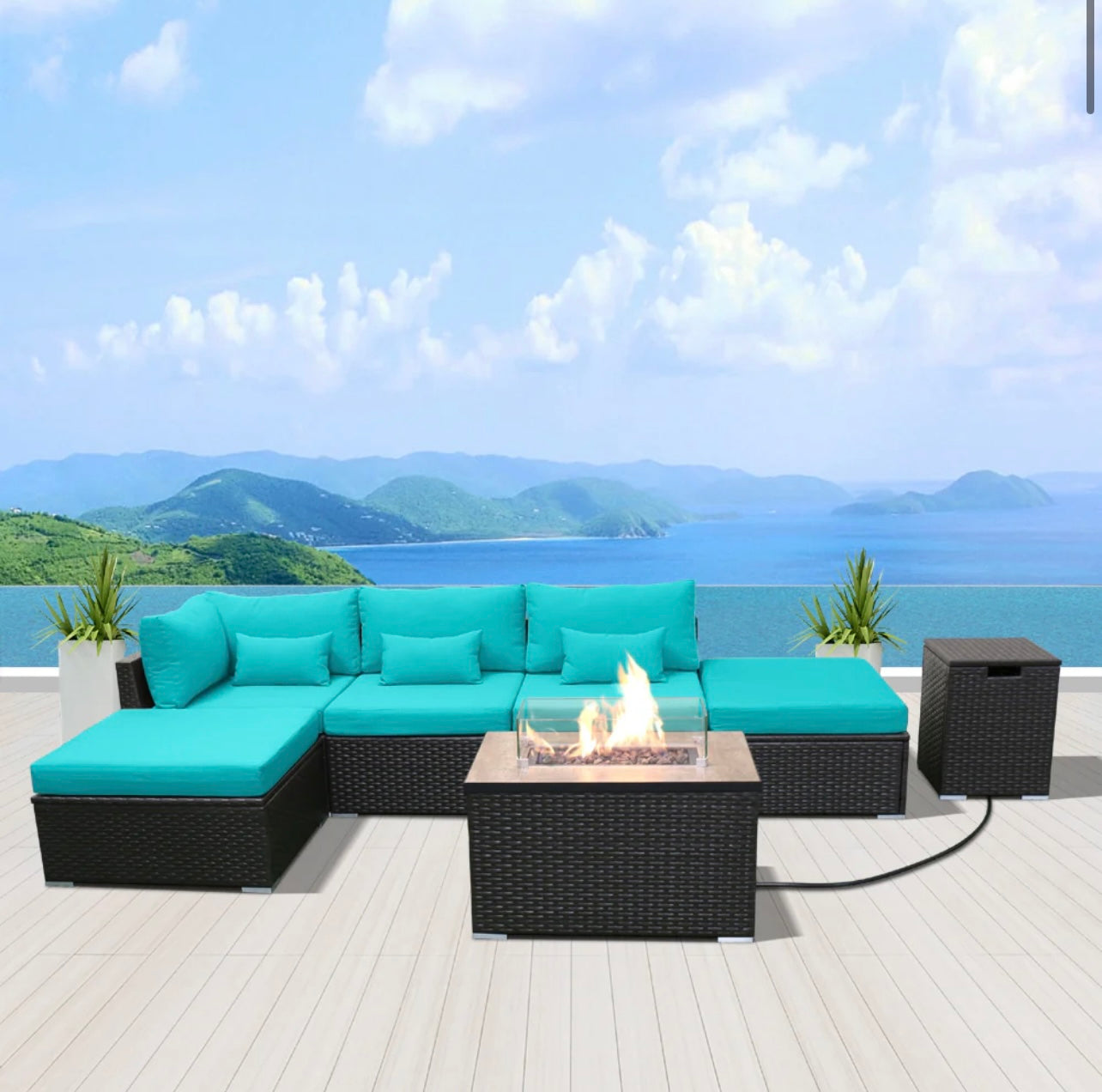 Yard Patio Couch Furniture Outdoor Sectional with Propane Fire Pit Table Espresso Brown Wicker Resin Garden Converse Sofa Set (Turquoise)