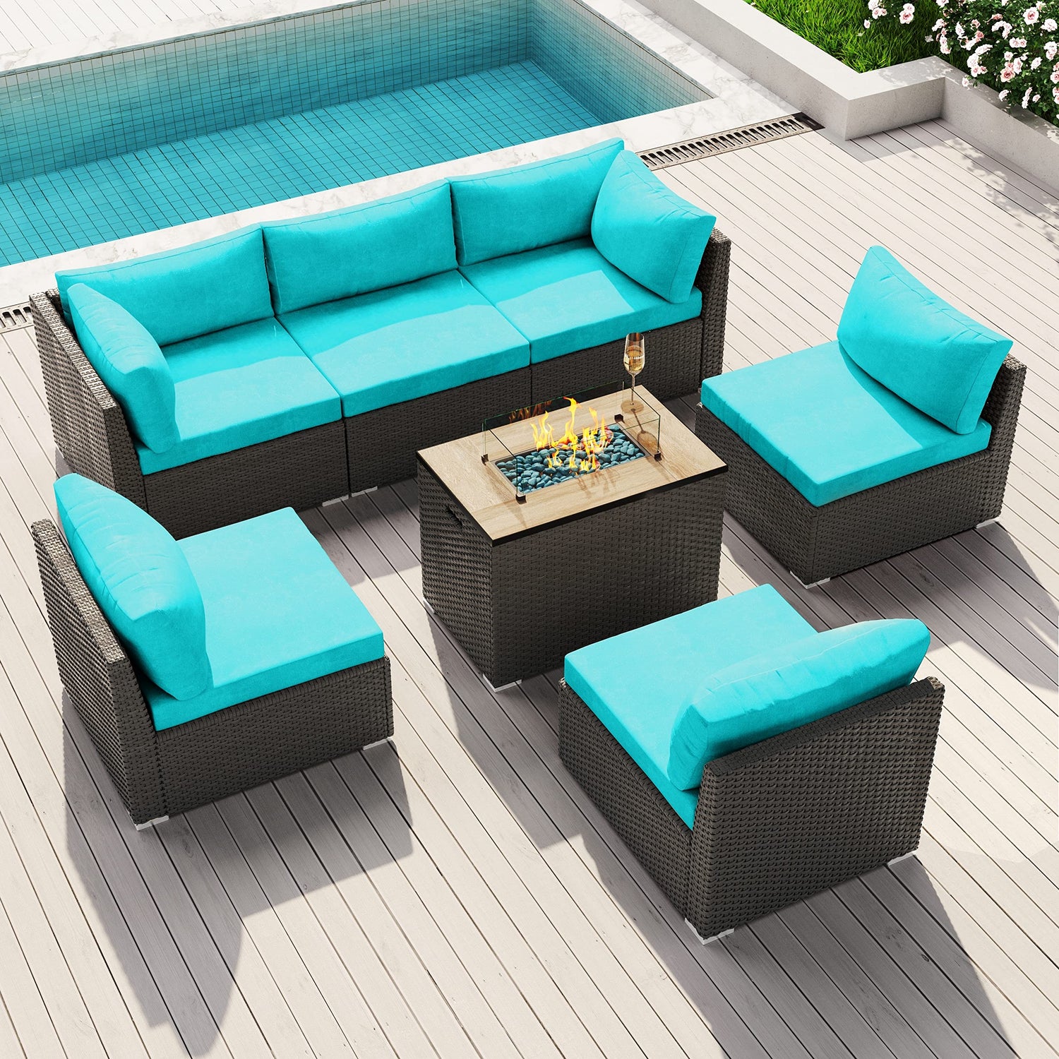 Yard Patio Couch Furniture Outdoor Sectional with Propane Fire Pit Table Espresso Brown Wicker Resin Garden Converse Sofa Set (Turquoise)